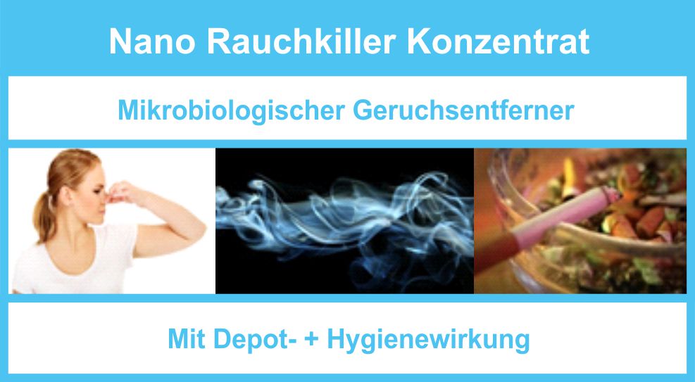 Nano-Rauch-Killer ist ein hochkonzentrierter, mikrobiologischer Geruchsentferner mit Depot- und Hygienewirkung. Das Produkt eliminiert Rauchgerüche/-rückstände ( kalter Rauch ) dort, wo organische Stoffe zersetzt werden. Geruchsbelästigungen werden an der Ursache bekämpft und nicht mit parfümierten Zusatzstoffen überdeckt. Das sorgt für eine nachweisliche Verbesserung der Hygiene.